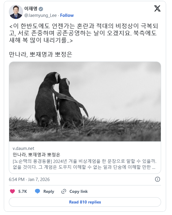 Writing on social media platform X, Lee said on Wednesday (Jan 7) he hoped for the day that “the abnormal state of turmoil and hostility on the Korean peninsula will be overcome”.